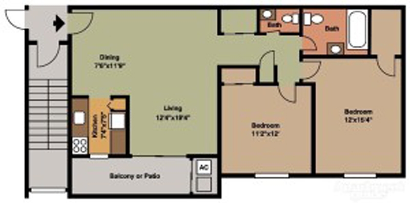 Each two bedroom apartment has a full bath plus a powder room. Second floor apartments have a cathedral ceiling. Nineteen foot living rooms with sliding glass doors leading to a sixteen foot balcony or patio. Exceptional closet space. Walk-in closet in master bedroom.